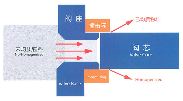 高压条件下的混悬液,高速通过一个可调节缝隙的均质阀,高速撞击、剪切和失压爆炸等综合效应,将较大的颗粒粉碎成很小 的微粒,它们的直径在0.01~2 μm范围内。这个纯粹的物理过程保持产品原有的活性,与此同时,获得相对稳定的乳化液。